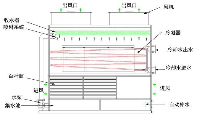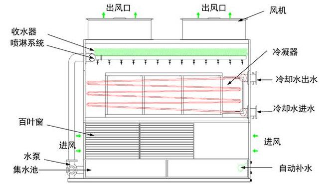 橫流式閉式冷卻塔的工作原理橫流式閉式冷卻塔以鋼板為主要結構,內部有額外的鋼結構框架。該產品為雙風扇結構,雙風扇由皮帶減速器由同一臺電機驅動。與橫流玻璃鋼冷卻塔相比,該產品最大的區別在于盤管和填料的完全