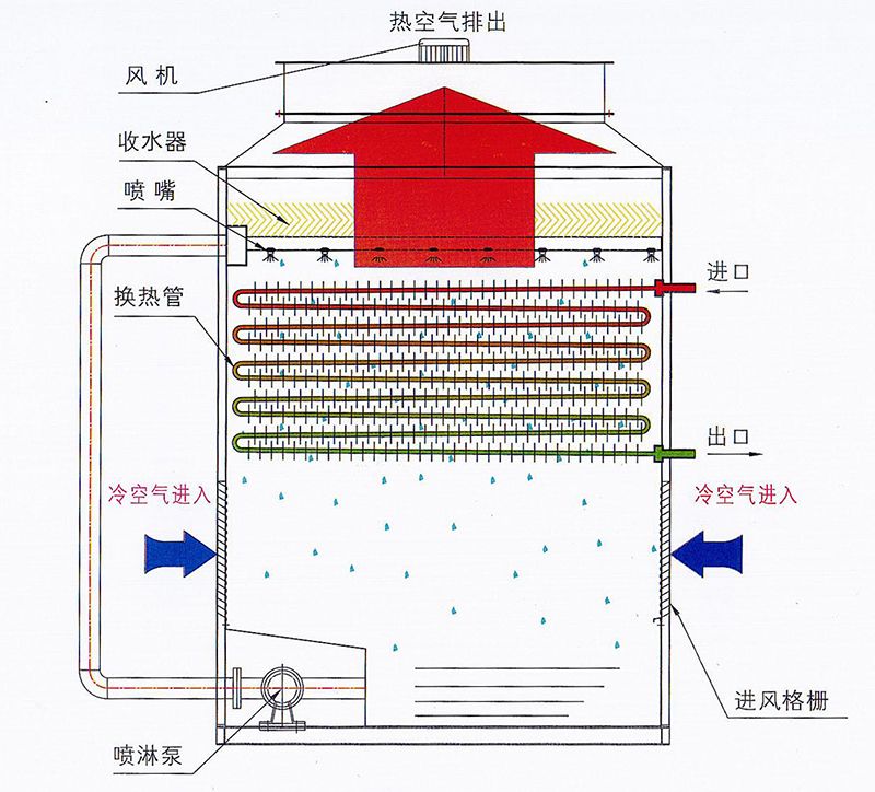 封閉式冷卻塔或封閉式冷卻塔或封閉式冷卻塔,簡而言之,其實是在傳統開放式冷卻塔的基礎上進行的升級和發展。閉式冷卻塔的特點是過程流體封閉循環,然后帶走多余的熱能。在我們的盤管換熱器中,流體、流動空氣和噴淋